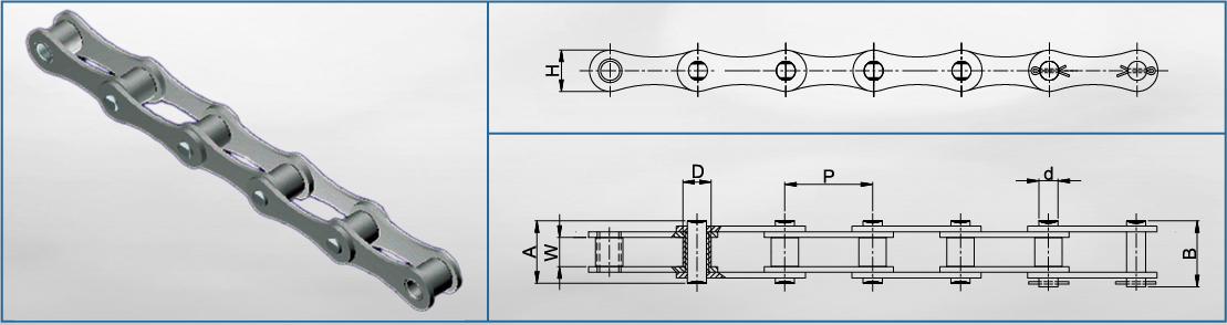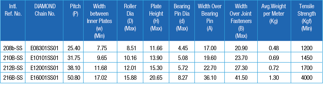 Stainless steel (SS 304) chains with solid rollers are designed to offer excellent corrosion resistance and are used in atmosphere where chains are exposed to chemical, water and heat. They can operate in a temperature range of -20° c to 400° c.